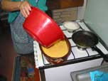 Depois de tudo bem misturado, enche-se um tacho de barro ou tabuleiro de alumínio ou qualquer outro recipiente apropriado (sempre untados com óleo de preferência ou então margarina).